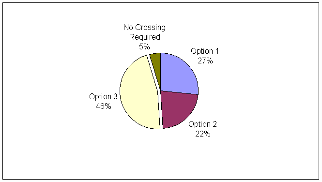 Option 1 – Zebra Crossing at the location previously proposed. Option 2 – Pedestrian refuge at new location (southern end of garage forecourt). Option 3 – Zebra crossing at the same location as 2 above. 6. It was witnessed on site that pedestrians tend to cross Banbury Road whenever an opportunity arises rather than on a particular desire line, although the number recorded is highest in Zone C where a high proportion crossed at the southern end near the mini-roundabout junction. It would not, however, be possible to provide a Zebra crossing at that particular location because of its proximity to the junction. The carriageway is also of insufficient width to provide a pedestrian refuge at that location. Consultation 7. Direct consultation on these options was undertaken with the local County Councillor, Cherwell District Council, Bicester Town Council, emergency services, other relevant bodies and 153 local residents including the Rowan Road development. Statutory notices were also erected on site. 8. Bicester Town Council have agreed as they did last year, that the Zebra crossing in its original location (Option 1) was the best option and felt it essential that the crossing should be near the junction of Buckingham Road and Banbury Road as many children attending Bicester Community College cross at that point. 9. Cherwell District Council fully supports the principle of a feature to aid pedestrian movements at Banbury Road along this stretch of the road, favouring a refuge (Option 2). They felt a refuge would encourage movements at a fixed point and that the hatched markings, necessary to install the refuge, would serve to calm traffic speeds generally at that location. 10. Thames Valley Police felt that the choice between the two Zebra crossing sites was marginal. However, they concluded that Option 1 coincided with the best pedestrian desire line and may, with the increased development in the area, become known as a safe place to cross and recognised as such. They suggested Option 1 could be considered in conjunction with a refuge at the northern site. The refuge acting as a complimentary measure in terms of road narrowing and any calming influence it may have. Residents’ Comments 11. Residents were invited by letter to indicate their preferred option on a form (with prepaid postage) and to comment generally on the proposals. Of the 153 residents consulted 86 responded, which represents a 56% rate of return. A summary of the responses is shown in the pie chart below.
